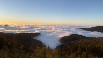 Als ich den Gipfel erreichte, bot sich mir dieser unglaubliche Anblick (siehe Foto). Ein endloses Nebelmeer, das die Täler verschluckt hat. Es war fast so, als stünde die Zeit still. Nur die dunklen Spitzen der Tannen ragten wie kleine Inseln aus dem Weiß heraus, während die tiefstehende Sonne alles in ein sanftes, goldenes Licht tauchte.