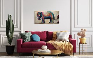 Ein kleines Bild auf einer großen Fläche wirkt verloren. Deshalb empfehle ich bei einer freien Wand mindestens 80 cm Breite. Über dem Sofa sollte das Gemälde etwa zwei Drittel der Möbelbreite einnehmen.