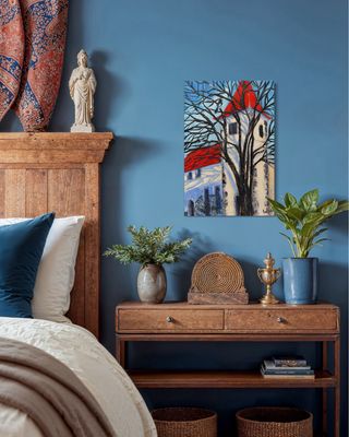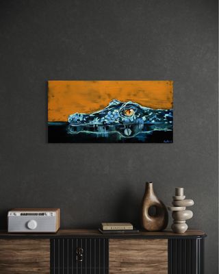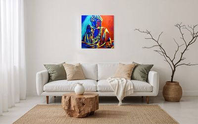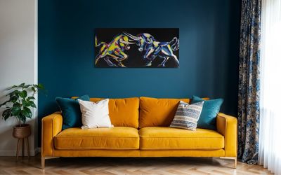 Das Gemälde setzt bewusst ein Statement – z. B. Blau-Gold in einem neutralen Raum.